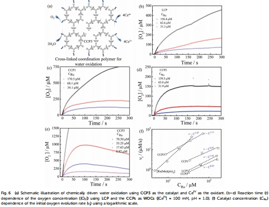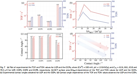 數據:Fig. 6b-e顯示氧氣產生隨時間變化,Fig. 6f初始速率v_i與Ru濃度呈準一級關系(指數α~1);Fig. 7a TOF/TON值CCP3最佳(TOF~0.85 s?1),Fig. 7c-d接觸角越?。ㄓH水性越強),活性越高。