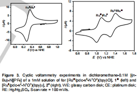 數(shù)據(jù):在DCM中,1???的Ru???/??電位E?/?=0.31 V;2??的Ru??/???和Ru???/??電位分別為1.32 V和1.05 V。在水溶液(pH 7)中,2??的Ru??/???和Ru???/??電位分別為1.23 V和0.89 V。