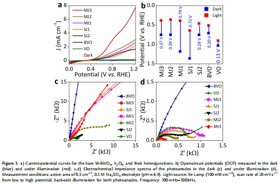 數據:開路電位顯示W-BiVO?和V?O?的光電壓分別為0.20和0.13 V;阻抗譜表明MJ3在光照下電荷轉移電阻(Rct)最低。