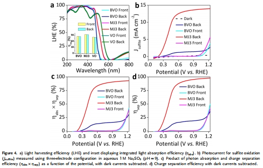 數據:背光照射下,MJ3的ηabs為94.0%,ηabs × ηsep在0.5和1.23 V vs. RHE時分別為74.5%和93.0%;ηsep高達98.9%(1.23 V)。