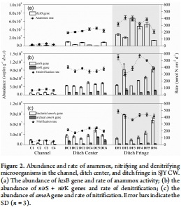 數據:Anammox細菌豐度在溝渠邊緣最高(3.82×10^7 copies/g),速率達339.4 nmol N/cm2/d;反硝化和硝化速率也最高在邊緣(反硝化449.6 nmol N/cm2/d,硝化424.6 nmol N/cm2/d)。