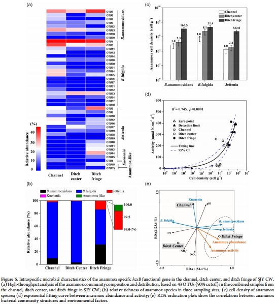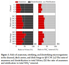 數據:在溝渠邊緣,anammox貢獻43.0%氮損失和44.4%銨去除;亞硝酸鹽來源中,銨氧化占55.8%,硝酸鹽還原占44.2%。