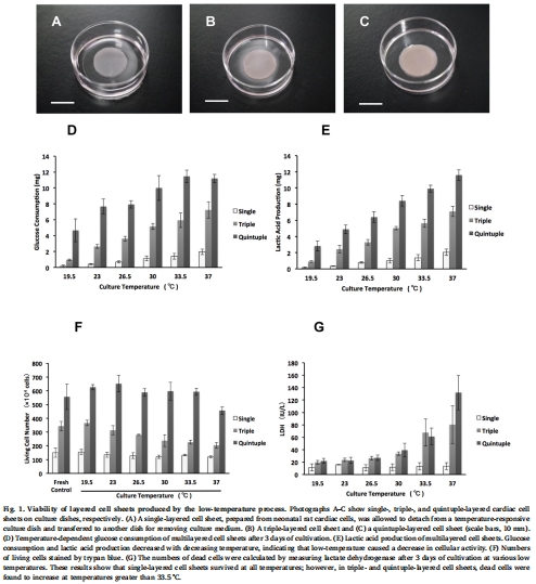 數(shù)據(jù):單層細(xì)胞片在所有溫度下均存活,但三層和五層細(xì)胞片在33.5°C以上死亡細(xì)胞增加(Fig. 1F-G);葡萄糖消耗和乳酸產(chǎn)生隨溫度降低而減少(Fig. 1D-E),例如30°C時葡萄糖消耗比37°C低約40%。