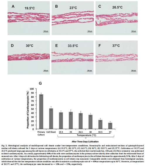 數(shù)據(jù):H&E染色顯示,37°C培養(yǎng)的五層細(xì)胞片出現(xiàn)核丟失和層間間隙,而30°C時組織致密(Fig. 2A-F);流式細(xì)胞術(shù)測心肌細(xì)胞比例,低溫培養(yǎng)(≤30°C)維持約40%,37°C降至15%(Fig. 2G)。