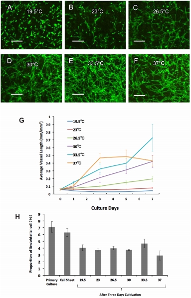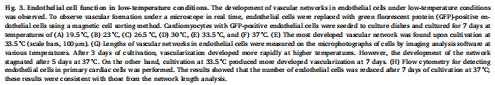 數(shù)據(jù):GFP標(biāo)記內(nèi)皮細(xì)胞顯示,33.5°C時血管網(wǎng)絡(luò)長度最大(Fig. 3A-G);37°C培養(yǎng)5天后網(wǎng)絡(luò)停滯,而33.5°C持續(xù)發(fā)展至7天(Fig. 3G)。
