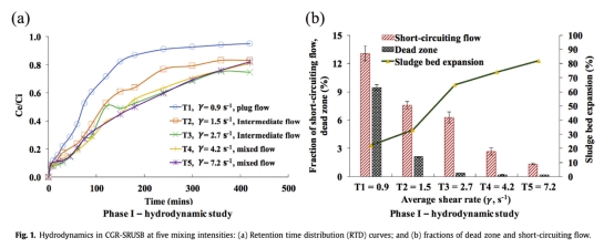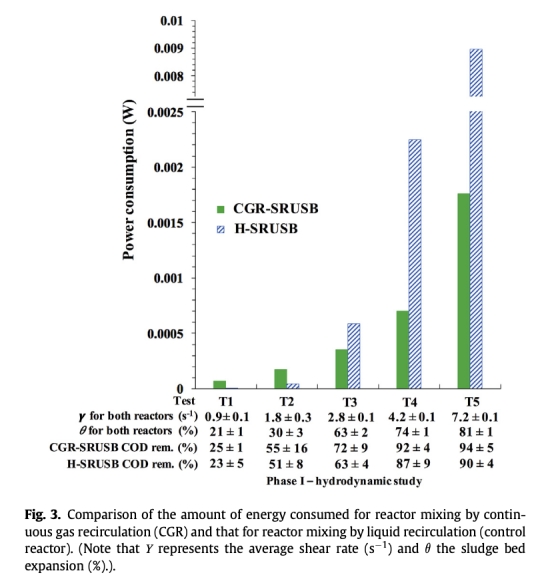 3 測量了能量消耗比較CGR混合和液壓混合,數(shù)據(jù)來自Fig. 3。研究意義是證明CGR混合更節(jié)能,在相同污泥床膨脹下消耗功率更低(0.0007 W),為反應(yīng)器設(shè)計提供經(jīng)濟性依據(jù)。