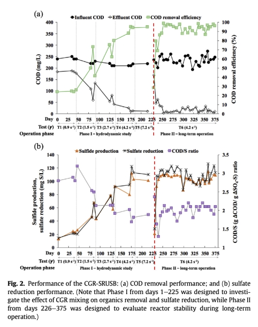2 測量了有機物去除和硫酸鹽還原性能,如COD去除效率和硫酸鹽還原量,數(shù)據(jù)來自Fig. 2。研究意義是驗證CGR混合能提高反應(yīng)器性能,在最佳混合強度下COD去除效率超過90%,硫酸鹽還原量高,表明硫酸鹽還原菌活性增強。
