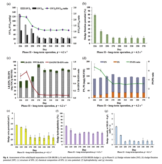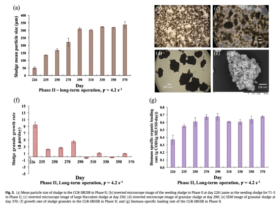 5 測量了污泥顆粒大小和生長率,數(shù)據(jù)來自Fig. 5a和Fig. 5f。研究意義是跟蹤顆粒化過程,表明在65天內(nèi)形成微顆粒(300-350 μm),生長率逐漸降低,有助于理解顆粒形成動力學。