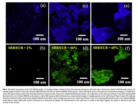 8 測量了微生物群落分布通過FISH分析,數(shù)據(jù)來自Fig. 6。研究意義是顯示硫酸鹽還原菌在顆粒中均勻分布(占65%),表明顆粒結(jié)構(gòu)均勻,支持高活性。