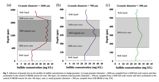 9 測量了硫化物濃度在污泥顆粒內(nèi)的剖面使用丹麥Unisense微傳感器,數(shù)據(jù)來自Fig. 7。研究意義是評估質(zhì)量傳遞,顯示小顆粒中硫化物濃度梯度低,表明質(zhì)量傳遞阻力小,底物滲透深。