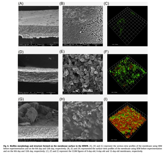 3 生物膜形態和結構數據,來自圖6(SEM和CLSM圖像)。研究意義是揭示生物膜隨時間的生長和膜污染過程,顯示生物膜從稀疏到成熟的變化,膜污染在12-16天完成,指導反應器維護和反洗策略優化。