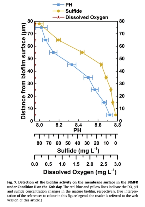 4 生物膜活性數據,包括DO、pH和HS-濃度剖面,來自圖7(使用Unisense微電極測量)。研究意義是量化生物膜內微環境變化,顯示硫化物在生物膜上層(45-80 μm)被快速消耗(80.7%),pH升高表明反硝化過程,證實生物膜的高活性區域和反應機制。