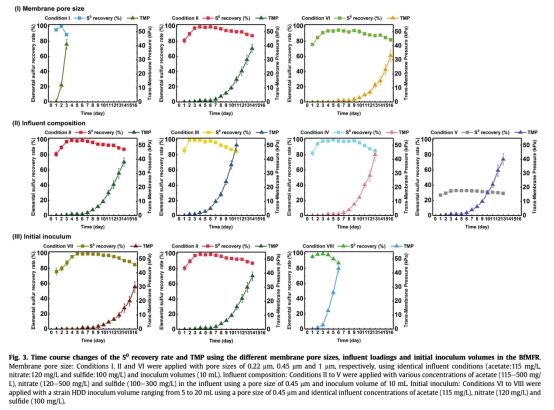 1 S0生成效率數據,來自圖3。研究意義是直接評估BfMFR在不同操作條件下的S0回收性能,顯示最佳條件(膜孔徑0.45 μm)下效率達98%,證明該方法高效可行,為優化反應器設計提供依據。