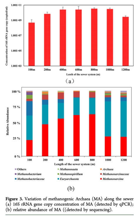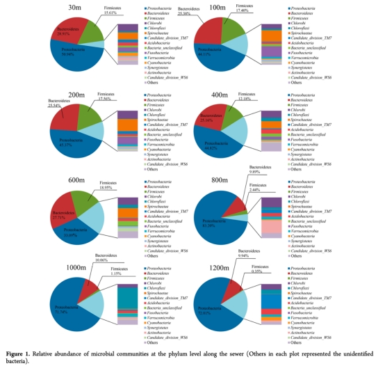1 測量了微生物群落在門水平和屬水平的相對豐度,數據來自圖1和圖2。研究意義:揭示Proteobacteria、Bacteroidetes和Firmicutes等主要門類沿下水道的變化,顯示微生物多樣性減少,幫助理解發酵和水解過程的空間分布。