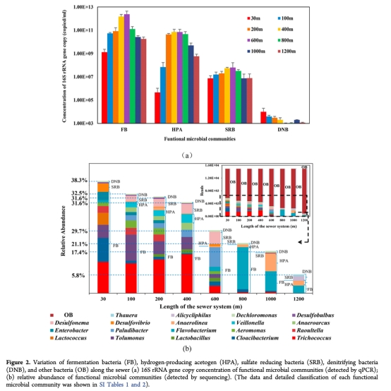 2 測量了功能微生物(FB、HPA、SRB、DNB、MA)的16S rRNA基因拷貝濃度和相對豐度,數據來自圖2和圖3。研究意義:量化FB、HPA、SRB、DNB和MA沿下水道的分布變化,表明FB在開始時富集,SRB和MA在末端占優勢,反映代謝過程的轉變。