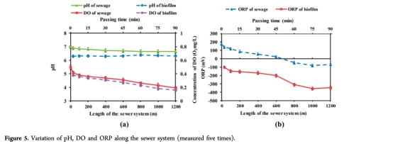 4 測量了環境因素(pH、DO、ORP)在廢水和生物膜中的變化,數據來自圖5。研究意義:顯示DO和ORP沿下水道降低,pH穩定,影響微生物群落分布和代謝活動,如低ORP促進產甲烷。