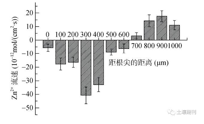 在對Zn2+微電極進行一系列優化和表征后,通過搭載非損傷微測系統對Zn/Cd超積累植物伴礦景天幼苗根際不同微區Zn2+離子流進行了測定。如圖4所示,伴礦景天在距離根尖600μm內Zn2+凈通量為內吸,且在300μm處有最強的吸收速率,在700~1 000μm處則有明顯的Zn2+外排信號。伴礦景天作為一種Cd/Zn超積累植物,其對高濃度的重金屬表現出一定的抗性和耐受性。通過非損傷微測技術發現其在根尖微區存在外排Zn2+的部位,這可能是其避免高濃度重金屬對其根部造成損害的一種主動防御措施,但是這種植物主動外排金屬離子的分子生物學過程機制目前尚不完全清楚,值得深入分析和研究。