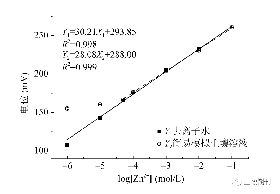 圖1 Zn2+微電極在去離子水和模擬土壤溶液中的校正曲線