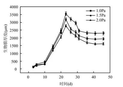 在不同的水力條件下,生物膜厚度的變化都有著相似的規律.首先,生物膜厚度的增長在15~25d內達到最大值,表明在這一階段生物膜的生長速率大于脫落速率.在厚度達到最大之后的5~10d左右,由于生物膜厚度的生長,使得脫落速率不斷增大而大于生長速率,因而生物膜厚度出現了一定程度的減小.最終,當生物膜的生長速率與脫落速率逐漸達到平衡,生物膜的厚度也趨于穩定.在本實驗條件下,1.0,1.5,2.0Pa 3種水力條件下對應的生物膜厚度分別為(2.3±0.1),(1.9±0.1),(1.6±0.1)mm。