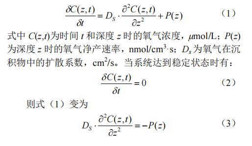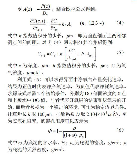 Jan等結合微電極建立了Profile模型,引入了氧氣凈產量的概念,即光合作用、呼吸作用以及擴散作用綜合的結果,來反映界面中有氧微生物的生命活動強弱。模型可以分辨水中汽泡、生物活動等偶然因素引起的異常數據,精確體現剖面結構,應用實測剖面溶質濃度數據和底泥孔隙度等作為邊界條件進行分層優化擬合計算得出每層的單位體積耗氧速率。對于DO剖面圖來講底部氧氣已耗盡,一般都是以一個恒定的濃度值0作為結束終點,即在剖面圖底部存在一個0濃度和0通量;而在H2S剖面的最頂部上方的一個區間里濃度值為0值,通量也為0通量,該模型主要基于Fick擴散第二定律