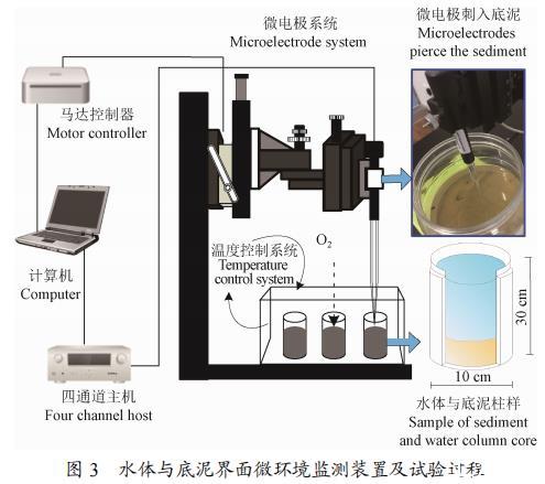 本試驗采用丹麥微電極(MM-METER,Unisense)系統在實驗室進行農田排水溝水體與底泥DO和H2S濃度剖面測量。該系統主要由微電極、四通道主機、馬達控制器、微電極推進器、Sensor Trace PRO軟件、實驗室支架LS18等組成(圖3)。