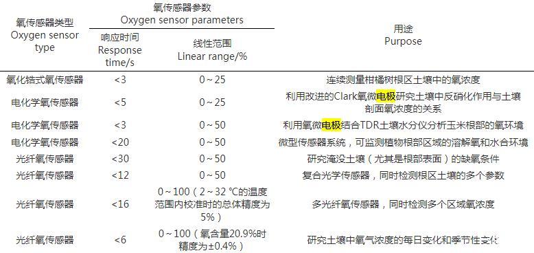 表1歸納對比了典型土壤氧傳感器的類型和適用范圍。氧化鋯氧傳感器具有較高的測量精度,響應速度較快,能夠迅速反映氧氣濃度的變化,但使用時必須加熱,而高溫會影響土壤氧環境,對測量結果產生較大影響,因此在土壤氧氣檢測領域應用較少。電化學氧傳感器原理簡單、精度高,但檢測過程中存在消耗氧氣和電極材料等問題,無法長期原位監測,檢測結果不穩定、重復性較差的問題,這與傳感器的腔室、電極和透氧膜的制作有關。光纖氧傳感器不需要消耗氧分子,也無需對樣品進行任何處理,可實現長期原位監測,在氧氣檢測領域具有很好的發展趨勢。但需要精密的光學儀器,且氧傳感膜的制作工藝困難,成本較高。