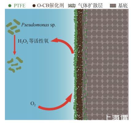 電催化生成活性氧殺菌,因低能耗、高效環保,無消毒副產物等特點,成為一種非常具有應用前景的電化學防污技術。在持續通電或者周期性通電的情況下,電極材料通過電催化氧還原產生H2O2等活性氧物質,該活性氧能阻止細菌在設施表面寄生定植形成生物膜,在污損形成過程早期殺滅細菌,以進而達到防止海洋生物附著的效果,且活性氧作用后產物為氧氣和水,綠色環保,對水體無危害。