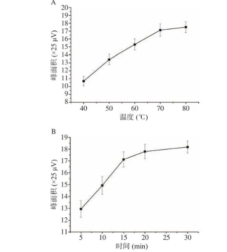 圖2頂空平衡溫度(A)和平衡時間(B)對氫氣峰面積的影響