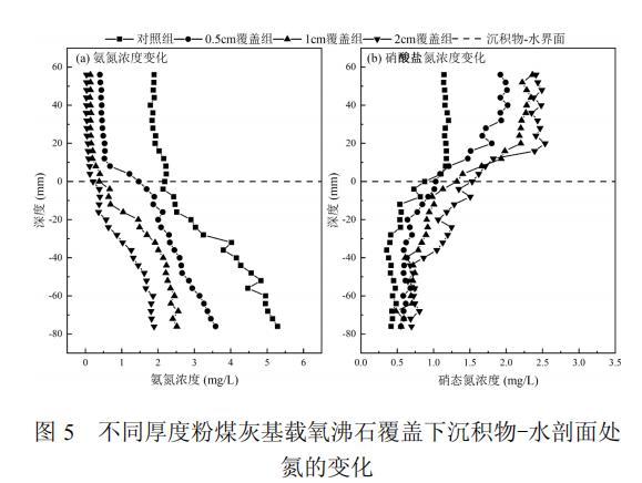 圖5不同厚度粉煤灰基載氧沸石覆蓋下沉積物~水剖面處氮的變化
