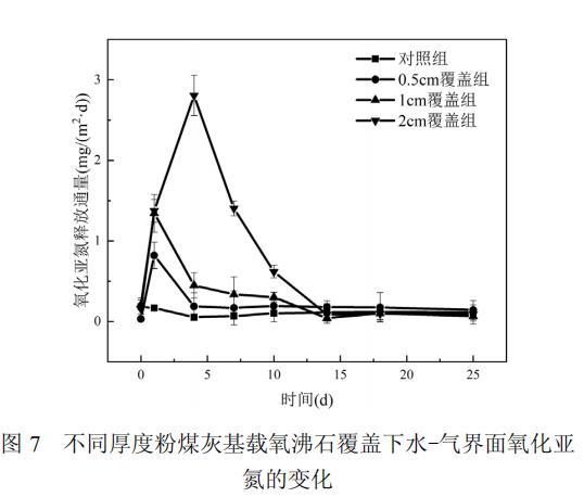 圖7不同厚度粉煤灰基載氧沸石覆蓋下水~氣界面氧化亞氮的變化