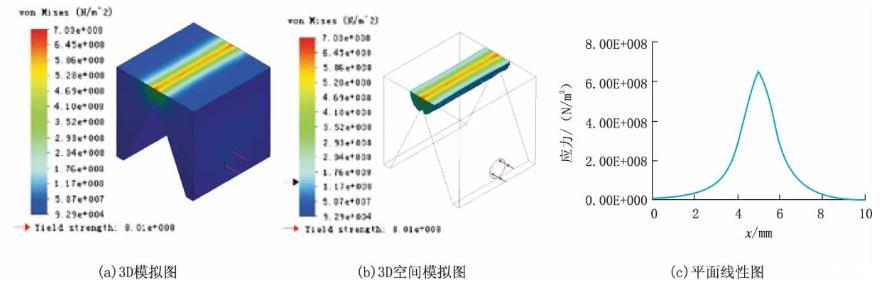 圖2所示為試樣在施加1 000 N外力作用下的應力分布模擬圖,其中包括3D圖和線形圖。從圖2可以看到,試樣缺口處的應力值最大,為6.4×108N/m2(約640 MPa),隨著離缺口距離越來越遠,應力值快速下降。