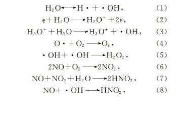 在放電功率為15 W,空氣流量為1 SLM,放電處理液為無菌水條件下,放電時間由0 s增長至300 s,溶液pH快速下降后趨于穩定,如表1所示,其主要化學反應為
