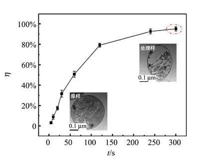 隨著放電時間增加,放電功率由5 W逐漸增加到25 W,小球藻殺滅效率由17.8%升高到99.9%.特別是在放電功率由15 W增加至25 W階段,放電充滿氣泡內部,產生大量活性物質,小球藻殺滅效果較為明顯。