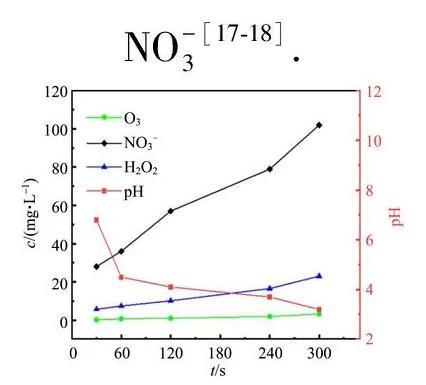 圖7放電產生O3,H2O2和含量及溶液pH隨時間變化曲線