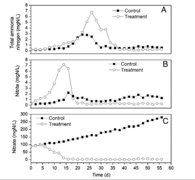 圖2.研究期間處理和控制水箱中總氨氮(A)、亞硝酸鹽(B)和硝酸鹽(C)濃度的變化。每個參數(shù)的值為三次重復(fù)樣本的平均值。