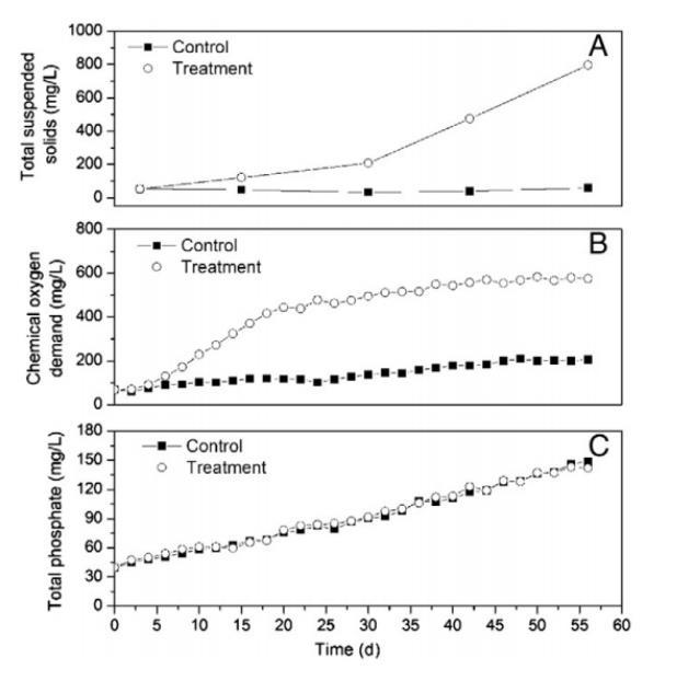 圖3.研究期間處理和控制水箱中總懸浮固體(A)、化學(xué)需氧量(B)和總磷(C)濃度的變化。每個參數(shù)的值為三次重復(fù)樣本的平均值。