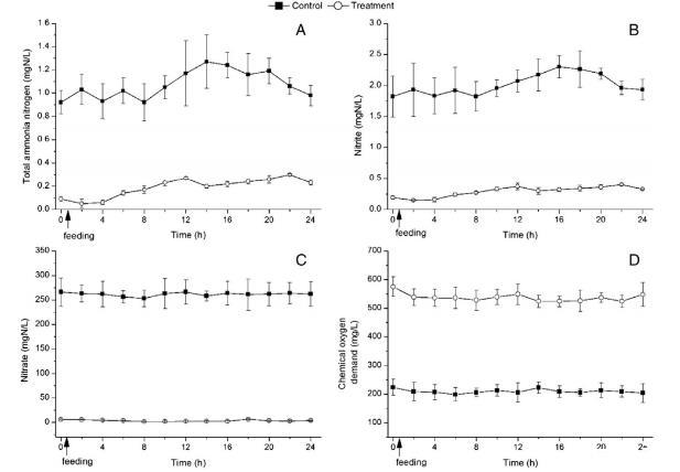 圖5.處理和控制水箱中總氨氮(A)、亞硝酸鹽(B)、硝酸鹽(C)和化學(xué)需氧量(D)濃度的晝夜變化。每個數(shù)據(jù)點是不同日期的三次測量的平均值。