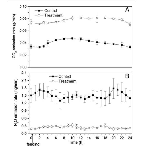 圖4.處理和控制水箱中CO2(A)和N2O(B)排放速率的晝夜變化。每個數(shù)據(jù)點是不同日期的三次測量的平均值。
