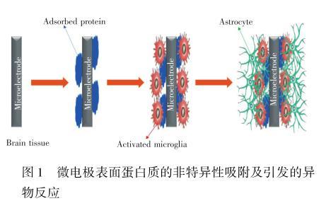 活體原位電化學(xué)分析方法是將微電極植入特定腦區(qū)原位監(jiān)測神經(jīng)化學(xué)物質(zhì)動(dòng)態(tài)變化的方法,該方法因具有高時(shí)空分辨率、高靈敏度和對(duì)腦組織損傷小等優(yōu)勢,受到越來越多的關(guān)注。但腦環(huán)境較為復(fù)雜,不僅存在許多小分子物質(zhì),而且還包含許多生物大分子。當(dāng)微電極植入到腦組織時(shí),生物大分子(特別是蛋白質(zhì))會(huì)迅速地吸附在微電極表面(此過程被認(rèn)為是生物污染的第一步)。吸附的蛋白質(zhì)會(huì)覆蓋電極表面部分活性位點(diǎn),阻止物質(zhì)傳輸和電子(電荷)轉(zhuǎn)移,最終導(dǎo)致微電極的靈敏度和選擇性降低。此外,微電極將不可避免地導(dǎo)致一系列不良的生物反應(yīng),如細(xì)胞黏附、血小板活化、血栓形成以及補(bǔ)體激活。這些過程將會(huì)導(dǎo)致電極周圍化學(xué)環(huán)境的改變,從而影響微電極對(duì)神經(jīng)化學(xué)物質(zhì)檢測的準(zhǔn)確性。此外,形成的纖維囊會(huì)完全阻礙電極表面上的電子轉(zhuǎn)移和物質(zhì)傳輸,從而導(dǎo)致微電極無法正常工作(圖1)。因此,抑制蛋白質(zhì)的非特異性吸附在一定程度上可防止電極表面生物污染。