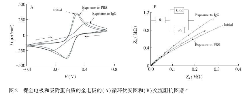 在電化學(xué)傳感器的研究中,不僅需要研究蛋白質(zhì)在電極表面的非特異性吸附,最重要的是研究蛋白質(zhì)吸附對(duì)電極電化學(xué)性能的影響。一般認(rèn)為吸附在電極表面的蛋白質(zhì)層是一個(gè)惰性的、非電化學(xué)活性的阻礙層,會(huì)影響電極的電化學(xué)性能,如法拉第電流、雙電層電容(Cd1)、電極阻抗,從而影響電極對(duì)待測物的電化學(xué)檢測結(jié)果,而且,這種影響隨著電極表面蛋白質(zhì)的覆蓋率增大而加劇,影響最大的是電極的法拉第電流。因在任何情況下,電極表面發(fā)生蛋白質(zhì)的非特異性吸附時(shí),電極表面和電解質(zhì)之間的電子(電荷)轉(zhuǎn)移速率都會(huì)受到嚴(yán)重阻礙,探針(或待測物)擴(kuò)散到電極表面發(fā)生氧化還原反應(yīng)也會(huì)被阻礙或完全阻止。