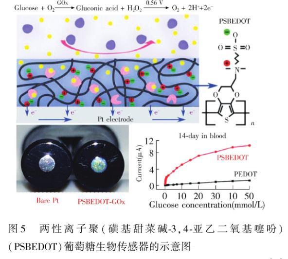 受這些天然膜分子抗蛋白質(zhì)吸附性能的啟發(fā),研究者合成了多種兩性離子聚合物,如SB、CB,或其類似結(jié)構(gòu)的材料,其中SB和CB已被廣泛用于各種抗蛋白質(zhì)吸附表面的修飾。Wu等使用一步電聚合法制備了基于兩性離子聚(磺基甜菜堿鄄3,4鄄亞乙二氧基噻吩)(PSBEDOT)鄄葡萄糖氧化酶(GOx)的葡萄糖傳感器。結(jié)果表明,該兩性離子膜具有優(yōu)異的抗纖維蛋白原和血漿蛋白質(zhì)吸附的性能(圖5)。Hu等采用電化學(xué)介導(dǎo)的原子轉(zhuǎn)移自由基聚合,在酶電極表面聚合兩性離子磺基甜菜堿甲基丙烯酸酯單體,在未稀釋的牛血清中浸泡15 d后,該電極減少了超過99%蛋白質(zhì)的非特異性吸附,并且其靈敏度在15 d后仍保持在94%以上,而裸電極的靈敏度僅保留了約5%。Sun等報道了一種通過仿生甜菜堿化合物用于檢測蛋白質(zhì)的抗蛋白質(zhì)非特異性吸附的微陣列電極。微陣列電極通過豐富的羧基和兩性離子聚合物修飾,有效捕獲抗體,防止了其它蛋白質(zhì)的非特異性吸附。