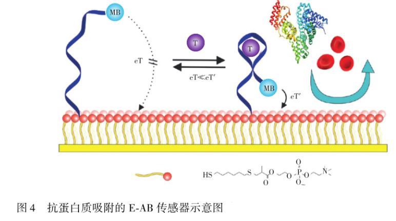 目前,兩性離子抗蛋白質(zhì)材料可分為3種類型:磷酸膽堿(PC),磺基甜菜堿(SB)和羧基甜菜堿(CB)。這些兩性離子聚合物具有良好的穩(wěn)定性和低成本等優(yōu)點,有望替代目前商品化使用最多的PEG,應(yīng)用于電化學(xué)生物傳感器和可植入性電極中。基于PC或者PC衍生物的自組裝膜均表現(xiàn)出優(yōu)異的抗蛋白質(zhì)吸附的性能和良好的電化學(xué)穩(wěn)定性,其性能優(yōu)于基于苯基PEG的自組裝膜(SAM)。Goda等通過邁克爾型加成反應(yīng),將2鄄甲基丙烯酰氧基乙基磷酸膽堿(MPC)連接到鏈烷二硫醇中的一個巰基,得到一個自組裝單層PC膜,該膜表現(xiàn)出優(yōu)異的抗蛋白質(zhì)吸附性能。Li等用磷脂酰膽堿(PC)自組裝單層膜構(gòu)筑了電化學(xué)適配體生物傳感器。PC自組裝膜中PC鏈比較短,不僅可能保證傳感器的電子轉(zhuǎn)移,而且能夠有效阻止蛋白質(zhì)或細胞在電極表面上的非特異性吸附,從而提高了傳感器在全血中的分析性能。在流動體系中,檢測全血12 h后基線漂移僅為10%,而未使用PC構(gòu)筑的傳感器降低了70%(圖4)。