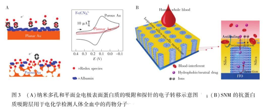 Sun等制備了孔道內(nèi)含有表面活性劑的超薄等孔徑二氧化硅膜(SNM),將其應(yīng)用于電化學(xué)傳感器的抗蛋白質(zhì)吸附。該電化學(xué)傳感器可直接檢測全血(無需預(yù)處理)中的藥物,并表現(xiàn)出優(yōu)異的抗蛋白質(zhì)吸附能力。這主要是由于:(1)直徑約2.3 nm的超小型通道的尺寸篩分能力,它只允許小的親脂性/中性待測物滲透到SNM中并富集,隨后被電極檢測到;而大的、帶電的和親水性物質(zhì)不能通過孔道到達電極表面;(2)高密度的、規(guī)則的、垂直排列的通道具有的高滲透性和低阻抗效應(yīng),保證了物質(zhì)的傳遞和電子轉(zhuǎn)移(圖3B)。