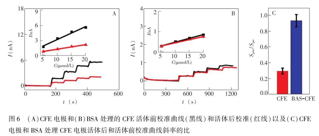 為了克服微電極必須在活體后校準的缺點,Liu等提出了用BSA處理微電極的方法進行活體原位分析,因他們發現微電極在BSA溶液中,電極的靈敏度會迅速降低,但BSA的濃度大于30 mg/mL時,電極的靈敏度不再下降,即使電極在與BSA電荷相反的蛋白質溶液中,電流響應也很穩定?;诖?,他們在活體檢測前用40 mg/mL BSA處理微電極,結果表明,活體前校準曲線的靈敏度和活體后校準曲線的靈敏度一致。并且,用BSA處理檢測多巴胺(DA)的CFE和檢測抗壞血酸(AA)的碳納米管修飾CFE,發現這兩種電極在活體前和活體后的校準曲線都是一致的,這說明了BSA處理的方法具有很好的普適性。該方法為活體電化學方法提供了可靠且簡單的電極前校準的策略(圖6)。