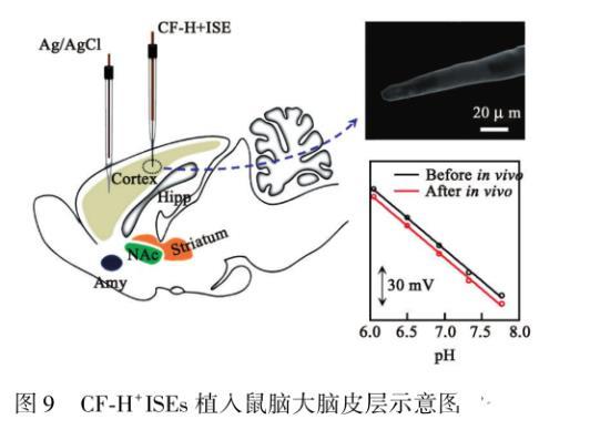 在電化學分析中,蛋白質吸附對不同信號輸出方式的影響不同,因此所使用的抗蛋白質吸附的方法也不同。Hao等發展了一種具有高抗蛋白質吸附性能的電位型傳感器可用于直接監測鼠腦中pH的變化。該電極通過使用H+選擇性膜(H+ISM)和含有增塑劑雙(2乙基己基)癸二酸酯,H+離子載體三癸胺和離子交換劑鉀四(4氯苯基)的聚氯乙烯聚合物基質制備。體外和體內研究均表明,CF H+ISEs電極具有很強的抗蛋白質吸附性能,CF H+ISE能夠在活體檢測后保持和活體前相同的靈敏度和可逆性(圖9)。