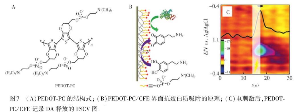 在提高微電極的抗蛋白吸附能力的同時保持微電極的靈敏度對活體檢測極其重要,Liu等進一步設計了聚合物單體EDOT PC(兩性離子磷酸膽堿官能化的乙烯二氧噻吩),并通過電化學聚合法將其可控地聚合在微電極表面,形成了具有類細胞膜結構的PEDOT PC超薄膜。其中由于PC端的電化學聚合自限制,形成了非常薄的PEDOT PC膜,保證了待檢測物在膜內的快速傳質。因此,PEDOT PC修飾的微電極不僅能夠有效地抗蛋白質的非特異性吸附,而且能保持電極的檢測靈敏度。利用PEDOT PC修飾的CFE準確監測了大鼠腦內KCl刺激,以及電刺激過程中DA的釋放。該研究有效解決了微電極在活體原位分析中蛋白質吸附的關鍵問題,為更好地研究腦神經化學的分子機制奠定了重要基礎(圖7)。