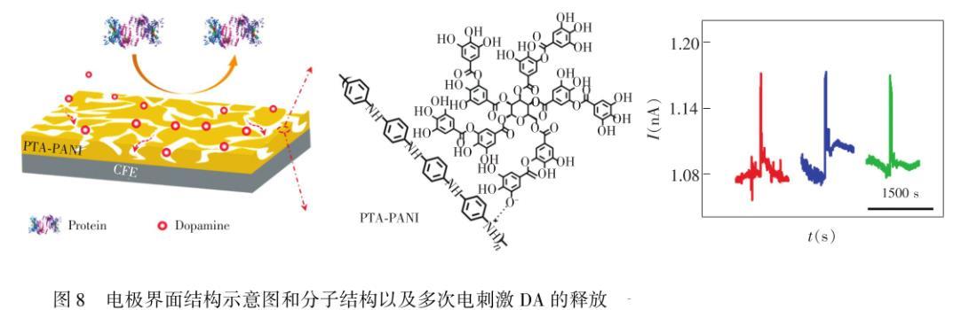 在微電極的表面構筑特殊結構也是有效克服蛋白質吸附造成分析性能下降的有效途徑。Zhou等在CFE表面構筑了一個高孔隙率的、有序的二氧化硅抗污染薄膜(SNM)。SNM能夠有效地防止蛋白質進入到通道中引起CFE電極表面的生物污染,同時對O2的擴散具有高滲透性?;铙w實驗表明:SNM/CFE可連續監測O2且能夠保持對其高的分析靈敏度和快速響應。為了能夠在構筑多孔結構的同時又具有高的親水性能,Feng等報道了一種聚單寧酸(PTA)摻雜的納米多孔導電聚苯胺(PANI)膜涂層,其中PANI構筑了多孔的結構,PTA的摻雜不僅使得PANI在中性溶液中保持了導電能力,而且PTA的多羥基使得構筑的PTA PANI多孔膜親水性能更強,并對DA具有很強的富集能力。所制備的PTA PANI修飾的CFE表現出高的抗蛋白吸附的能力,活體前和活體后DA的校準曲線靈敏度基本一致,并且活體檢測DA的釋放具有高的穩定性(圖8)。