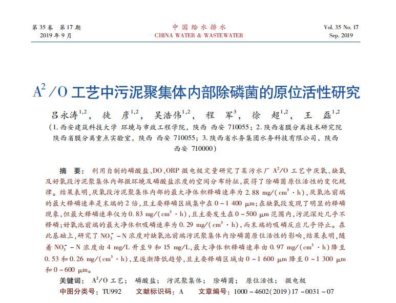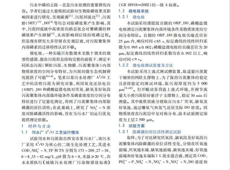 結果表明,厭氧段污泥聚集體內部的最大凈體積釋磷速率為2.88mg/(cm^3·h),厭氧池前端的最大釋磷速率是末端的2倍,且主要釋磷區域集中在0——1400μm;在缺氧段發現了明顯的釋磷現象,但最大釋磷速率僅為0.83mg/(cm^3·h),且主要發生在0——500μm范圍內,污泥深處幾乎不釋磷;好氧池前端的最大凈體積吸罐速率為0.29mg/(cm^3·h),而末端的吸磷反應幾乎停止。在此基礎上,研究了NO3^--N濃度對缺氧池前端污泥聚集體內除磷菌原位活性的影響,結果表明,隨著NO3^--N濃度由4mg/L升至9和15mg/L,最大凈體積釋磷速率由0.97mg/(cm^3·h)降至0.53和0.26mg/(cm^3·h),呈逐漸降低趨勢,且主要釋鱗區域由0——1600μm降至0——1300μm和0-600μm。