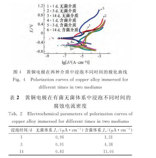 (3)極化曲線顯示,含菌溶液中電極的腐蝕電流密度明顯大于無菌溶液中;無菌溶液中黃銅電極的腐蝕電流密度隨浸泡時間的延長逐漸減小,而在含菌體系中電極腐蝕電流密度隨浸泡時間的延長顯著增大,浸泡14 d的腐蝕電流密度比浸泡1 d時增大到8倍以上。