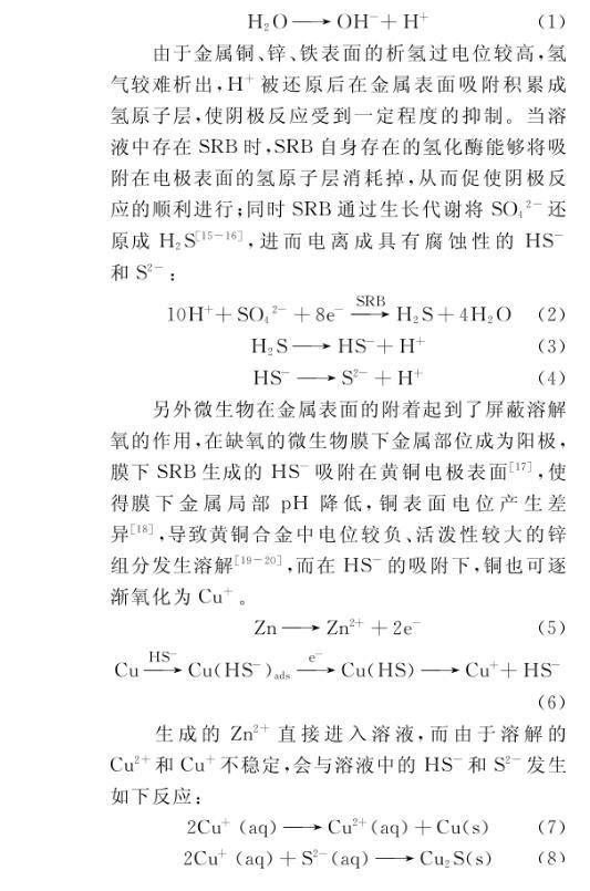 另外微生物在金屬表面的附著起到了屏蔽溶解氧的作用,在缺氧的微生物膜下金屬部位成為陽極,膜下SRB生成的HS-吸附在黃銅電極表面,使得膜下金屬局部pH降低,銅表面電位產生差異,導致黃銅合金中電位較負、活潑性較大的鋅組分發生溶解,而在HS-的吸附下,銅也可逐漸氧化為Cu+。